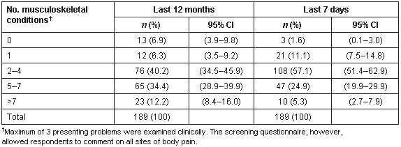 Table 3: Number of reported musculoskeletal conditions (ache, pain, discomfort) in the 7 days and 12 months prior to the study