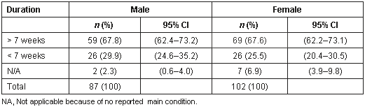 Data presented (Table 3) show that 87% of the participants reported multiple musculoskeletal conditions in the previous week. The majority of community members (64%) reported experiencing the main condition for 7 weeks or more (Table 4).