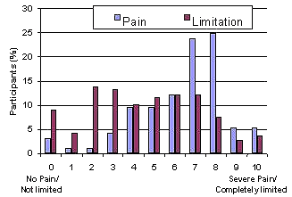Participants rated their pain as relatively high compared with the associated levels of limitation (Fig 1). Of those surveyed, in the 7 days prior to the study, 68% (95% CI: 61%-74%) reported experiencing high levels of pain (ie between 7 and 10). The number of participants who said their symptoms significantly limited (ie rated between 7 and 10) their activities of daily living was 38% (95% CI: 31%-45%).