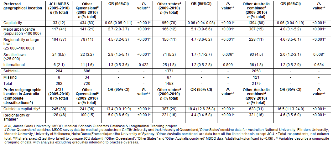 This study shows that JCU medical graduates appear to prefer different geographic locations of future medical practice and different specialty interests than those from other Australian medical schools in this study, as was predicted by the design of the program. At graduation, almost nine in ten JCU graduates intended to practise outside capital cities, compared with approximately one-third of graduates from elsewhere (Table 1). Just under half of the JCU graduates intended to work in rural towns or small regional towns and centres (population <100 000), compared with one in six from the comparator schools. Both larger regional and smaller rural and remote locations in Queensland (along with other rural and remote areas in Australia) could expect workforce benefits from JCU graduates.