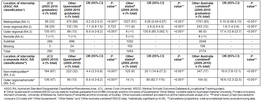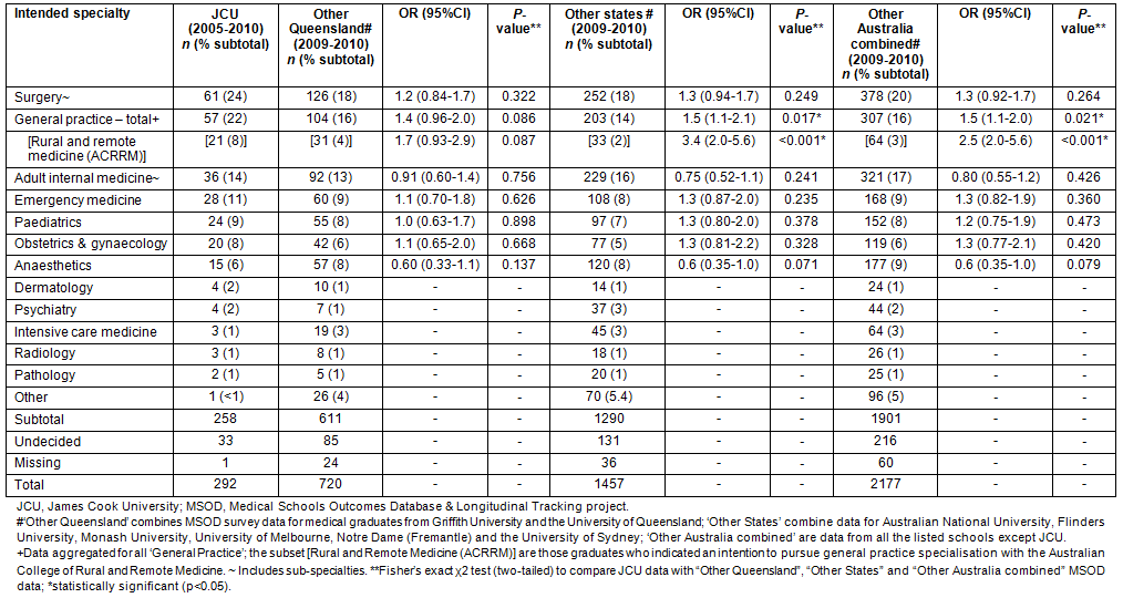 Major outcomes for the 6 JCU graduate cohorts, compared with graduates from the comparator universities from Queensland and elsewhere, are summarised in tables showing preferred geographic location, the medical specialty that students were most interested in pursuing at graduation, and the geographic area (ASGC-RA index)8 for the Australian city or town where JCU graduates had been accepted to undertake an internship (Tables 1-3, respectively).