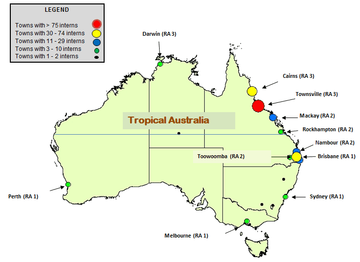 Figure 1: Location (city or town) of where JCU MBBS graduates (n=289) were accepted for internship between the years 2006 and 2011. Size and colour of the circle represents the number of JCU MBBS interns who spent the majority of a calendar year in that city or town. Large red circle = Townsville (>75 interns); yellow circles = Cairns and Brisbane (30-74 interns); blue circles = Mackay, Nambour and the Gold Coast (11-29 interns); green circles = Rockhampton, Darwin, Toowoomba, Perth, Sydney and Melbourne (3-10 interns); black dots = 1 or 2 interns. RA, Remoteness area (Australian Standard Geographical Classification).