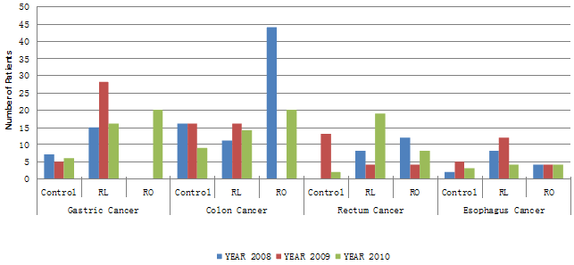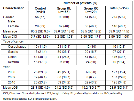 Patients from Gujiao, Loufan, and Yangqu counties admitted for surgical treatment of digestive tract cancer within the general surgery department of Taiyuan Central Hospital were sampled from January 2008 to December 2010. Patients directly admitted without referral were designated as the control group. Patients referred from secondary hospitals within the consortium were grouped into referral by outreach specialists (RO) and referral by local doctors at secondary hospitals (RL), respectively.