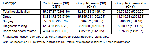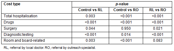 The regression-adjusted costs are included in Table 2. After adding referral type as a factor in the comparison of cost, significant differences were found between the three groups (Table 3) for total hospitalisation costs and drug costs. Both of these costs were the highest for the control group, followed by the RL and then the RO groups. There was at most a weak significant difference found between the three groups (Table 3) for surgery costs. Significant differences in diagnostic testing costs were found between the groups, with the highest costs seen in RL followed by the control group; the lowest costs were seen in RO (Table 2). Regarding room and board-related hospitalisation costs, the average costs of RL and RO were significantly lower than that of the control group but there was no significant difference between RL and RO (Table 3).