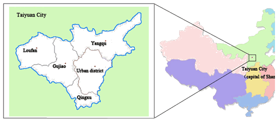 Figure 1: Taiyuan city, capital of Shanxi province, located in central China. Study areas indicated by red dots.