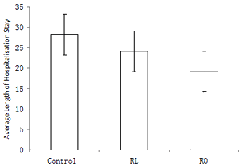 The length of stay (LOS) values for both the RO (19.2 ± 3.7 days) and RL (24.2 ± 5.9 days) groups were significantly lower than that of the control group (28.3 ± 4.9 days) (p<0.01, RO vs control; p<0.01, RL vs control); the LOS of RO was lower than that of RL (p<0.01; Fig3).