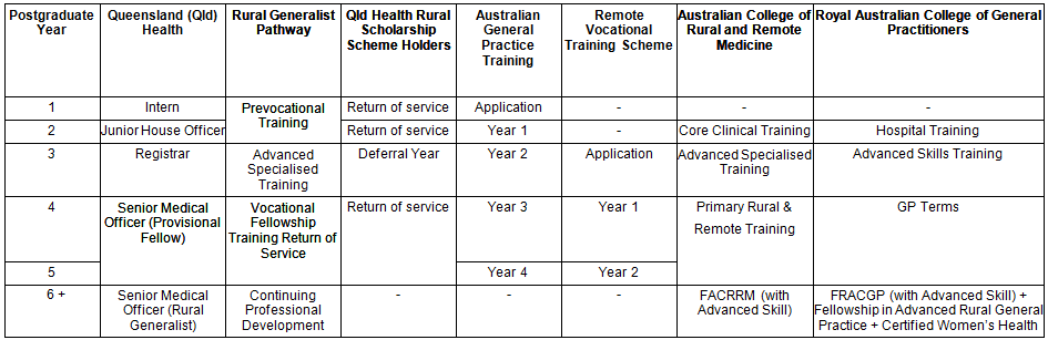 Finally, detailed exploration of existing vocational pathways to rural practice helped better understand the reasons for the undersupply. A new training pathway was devised building on existing training arrangements (Table 1). The intent was to enhance rather than duplicate existing pathways, blending a training program with a career pathway and industrial recognition in an attractive, incentive-based strategy to provide a sustainable medical workforce for rural Queensland. The pathway's design enabled state government scholarship holders to meet return-of-service requirements concurrently with their vocational training program9.