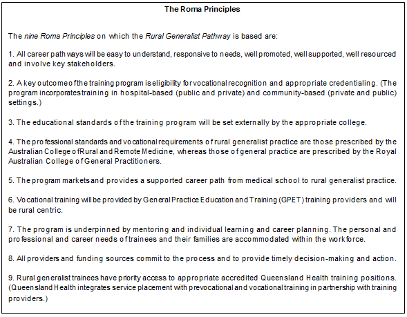 In 2005 a seminal meeting in the Queensland town Roma of representatives of Queensland Health, ACRRM, and other stakeholders established 'The Roma Agreement', which committed to12: