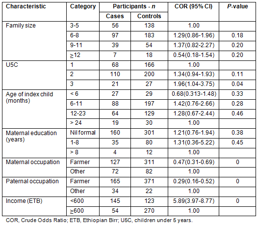 Among households with children under the age of 5 years there was a response rate of 96.7% and 199 cases and 393 controls were included in the study. The remaining 20 (5 cases and 15 control) households were non-respondent. Four hundred and eighty-seven (82.3%) interviews were conducted with mothers of children under 5 years of age and the rest with caretakers.