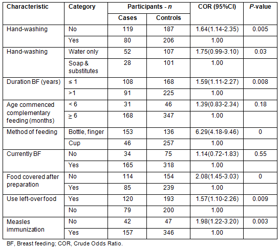 The acute childhood diarrhoea had significant associations with duration of breast feeding of children (p=0.008), hand-washing (p=0.005), covering of food after preparation (p<0.001), consumptions of left-over food stored at room temperature (p=0.009) and measles vaccination (p=0.003) (Table 3).