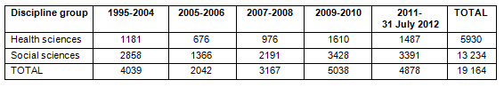 The break-down of numbers of abstracts in the health sciences versus the social sciences, according to each time period, is given (Table 1). The categories 'health sciences' and 'social sciences' in SCOPUS are not entirely mutually exclusive; however, they are sufficiently exclusive to make comparisons meaningful using the chosen method. Most sub-disciplines listed under the health versus social sciences are different. However, there are exceptions; for example, for the 1995-2004 period, 'health sciences' includes a category of papers called 'agricultural and biological sciences' (91 papers) but there are 247 'agricultural and biological sciences' papers listed under the 'social sciences' disciplines for the same period.