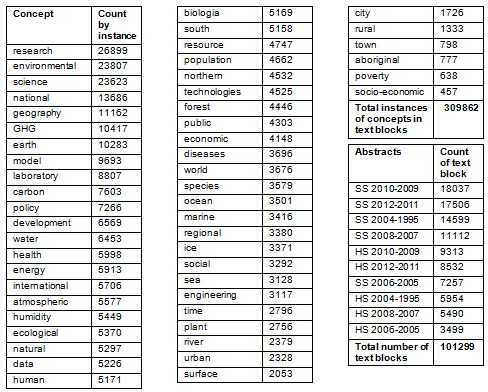 Simple counts of the 52 concepts are provided (in Table 2; their instances in text blocks, as well as total counts of text blocks split by period and whether health services or social sciences abstracts).