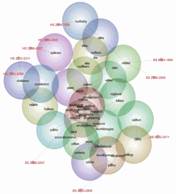 Accordingly, as Figure 1 suggests, when all abstracts from the health sciences and social sciences are considered (the total set of disciplines that might offer adaptation knowledge) the dominant focus is on GHG emissions and energy issues and this is most true of the social sciences in the period 2012-2011. Economic (but not socio-economic) policy storylines are also dominant in the recent (2010-2009) social sciences literature. Where 'social' concepts occur, they do so relatively infrequently and tend to be connected to storylines about 'development' and 'policy' concepts. 'Rural' concepts (in the green sphere) are relatively less frequent, typically associated with social science research, and tend to be connected to storylines about 'socio economic' and 'environmental' concepts.