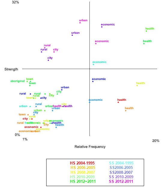 In the most recent period in the health sciences, the 'Aboriginal' concept is still very infrequent in the language of sentiment (positive or negative; Fig2). However, where it does occur it has included a sufficient number of positive associations to appear more positively than many other low-frequency concepts (in sentiment) in the bottom left-hand corner of the quadrant. For example, in health sciences abstracts in 2012-2011, the concept 'Aboriginal' was much lower in frequency in the language of sentiment than the concept 'economic' in, for instance, the social sciences abstracts of 2010-2009. Yet the two concepts in those two bodies of abstracts (HS 2012-2011 vs SS 2010-2009) are level in terms of positive associations.
