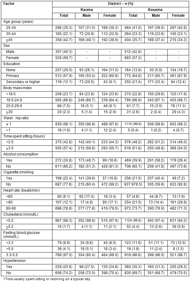 Overall 6.5% of males and 12.0% of females in Kaoma (p=0.062) were overweight/obese, compared with 3.4% of males and 15.6% of females in Kasama (p<0.001). Overall 1.9% of participants in Kaoma and 0.4% of participants in Kasama had a waist:hip ratio of >1 . More than half participants (57.4% in Kaoma & 51.8% in Kasama) usually spent ≥3.5 hours sitting or reclining on a typical day. In both Kaoma and Kasama, significantly more males consumed alcohol (48.7% vs 18.8% females, p<0.001 in Kaoma; 58.2% vs 26.4%, p<0.001 in Kasama). Similarly, regarding smoking, 39.6% of males and 10.8% (p<0.001) of females in Kaoma smoked cigarettes, as did 40.4% of males and 7.2% of females (p<0.001) in Kasama. High levels (>5.2 mmol/L) of cholesterol were recorded in 1.1% of males and 2.1% of females (p=0.409) in Kaoma; and 2.6% of males and 5.8% of females (p=0.011) in Kasama. Raised fasting glucose levels of >5.5 mmol/L were recorded in 5.15 of males and 3.4% of females (p=0.300) in Kaoma; and 2.4% of males and 1.3% of females (p=0.291) in Kasama. In both Kaoma and Kasama, more females than males had heart rates >90 beats/min (17.1% vs 4.8%, p<0.001 in Kaoma; 26.8% vs 14.4%, p<0.001 in Kasama, respectively).