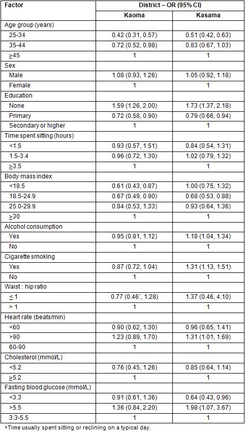 When compared with the findings from Lusaka, Zambia6, the risk factors (from multivariate analysis) of the Kaoma residents are a subset of Lusaka residents, while Kasama's smoking and heart rate were not included in findings in the Lusaka survey. These contrasting risk factors may reflect the differing developmental stages of these two rural districts. This finding further indicates the importance of establishing risk factors for hypertension in specific locations, rather than inferring results from one location to another. No literature was found for comparison regarding smoking and heart rate in rural settings. However, studies have shown that smoking is becoming more prevalent in developing than developed countries18. Its association with hypertension has been clearly demonstrated19.