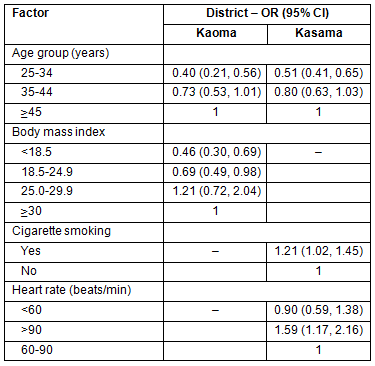 In Kasama, the factors that were significantly associated with hypertension in multivariate analysis were age, smoking and heart rate (Table 3). Participants of 25-34 years were 49% (AOR=0.51, 95% CI [0.41, 0.65]) less likely to be hypertensive compared with participants aged 45 years and older. Compared with participants who were non-smokers, smokers were 21% (AOR=1.21, 95% CI [1.02, 1.45]) more likely to be hypertensive. Participants with heart rate >90 beats/min were 59% (AOR=1.59, 95% CI [1.17, 2.16]) more likely to be hypertensive compared with participants with heart rate 60-90 beats/min.