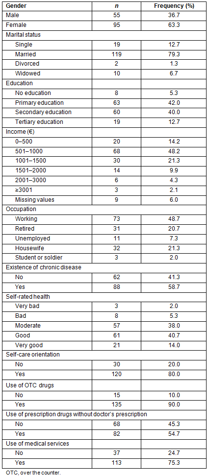 Regarding the use of medical care, 75.3% (n=113) of the sample had visited a doctor during the 3 months before the survey. However, self-care orientation was not found to affect the use of medical services: p(Fisher's exact test)>0.05.