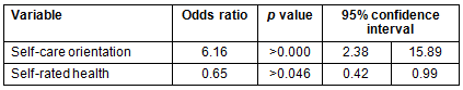 With regard to using prescription medications without a doctor's prescription, the analysis revealed that a quite high percentage (54.7%, n=82) of the respondents used prescription medications without the prerequisite of prescription. The likelihood of this specific use is defined by self-care orientation and the self-rated health status (Table 3).