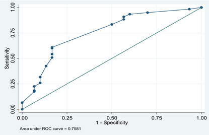 The area under the ROC curve is 0.76, a relatively high explanatory value for the statistically significant values of the model (Fig1).