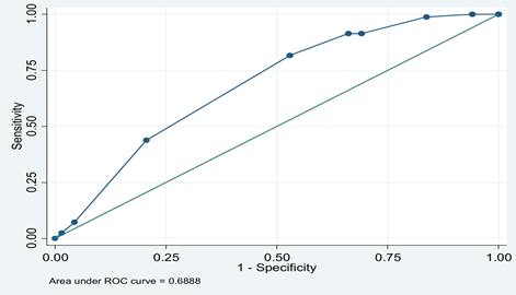 The area under the ROC curve was 0.69, a relatively high explanatory value for the statistically significant values of the model as indicated in Figure 2.