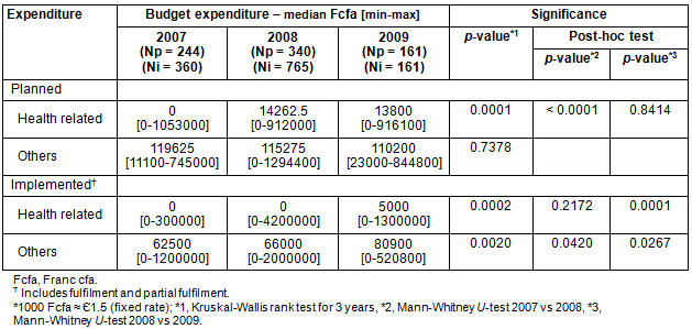 The median budget for health-related activities in each year also increased (p = 0.0001). The budgets for health-related activities in the 2 years after distribution of the 10QC were higher than in the year before distribution (2007 vs 2008, p <0.0001; 2008 vs 2009, p=0.8414; Table 2). The budgets for other activities did not show any statistically significant changes (p=0.7378). Expenditure for health/hygiene activities increased one year after distribution (p=0.0001), as did expenditure for other activities (p=0.0267).