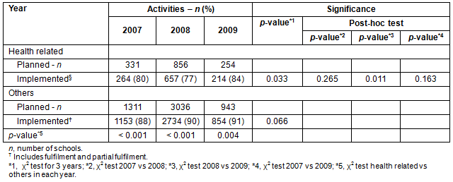 Fulfilment or partial fulfilment rates for health-related activities in the years 2007, 2008 and 2009 were 80%, 77% and 84%, respectively. For other activities, the rates for the same years were 88%, 90% and 91%, respectively (Table 3). The rate of health-related activities in 2009 was slightly higher than in 2008 (p=0.011), but not different from 2007 (p=0.163). Fulfilment/partial fulfilment rates of health-related activities were lower than those of other activities in all three fiscal years (2007, p <0.001; 2008, p <0.001; 2009, p=0.004).