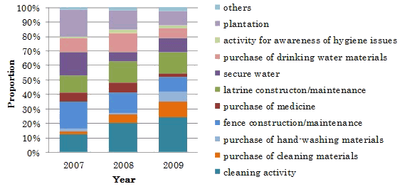 Details of implemented health-related activities are shown (Fig2). The proportion of respondents that indicated 'purchase of cleaning materials' among health-related activities were 2%, 6% and 11% in the years 2007, 2008 and 2009, respectively, and tended to increase after distribution of the 10QC (p <0.001, post-hoc test; 2007 vs 2008, p=0.014; 2008 vs 2009, p=0.011). 'Cleaning activity' also increased after distribution of the 10QC and the proportion remained the same at one year after distribution. The proportions for the years 2007, 2008 and 2009 were 12%, 20% and 24%, respectively (p=0.003, post-hoc test; 2007 vs 2008, p=0.005; 2008 vs 2009, p=0.230). 'Purchase of hand-washing materials' did not show any change in the first year after distribution. However, at one year after distribution, the proportion increased significantly, with proportions for the 3 years of 2%, 1% and 7%, respectively (p<0.001; post-hoc test; 2007 vs 2008, p=0.311 and 2008 vs 2009, p <0.001). 'Fence construction/maintenance', on the other hand, tended to decrease after distribution with proportions for the three years of 19%, 14% and 10%, respectively (p=0.032, post-hoc test; 2007 vs 2008, p=0.079, 2008 vs 2009, p=0.157, and 2007 vs 2009, p=0.011). 'Purchase medicine' also decreased one year after distribution, with proportions for the 3 years of 6%, 7% and 2%, respectively (p=0.048, post-hoc test; 2007 vs 2008, p=0.669 and 2008 vs 2009, p=0.013). 'Latrine construction/maintenance' did not change significantly with proportions for the 3 years of 12%, 15% and 15%, respectively (p=0.485). The median expenditure for the activities that increased ranged from 2,000-10,000 Fcfa, whereas the median expenditure for activities which decreased or did not change ranged from 9,000-61,250 Fcfa. Overall, these expenditures indicate that relatively low-cost activities tended to increase and that relatively high-cost activities tended to decrease.