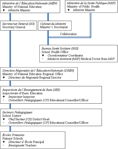 In Niger, the Bureau Santé Scolaire (School Health Office: BSS, Appendix I, II) was constituted in 2003 and established in 2005 with the aim of strengthening HPS as a national program13,14. This bureau is administered by the Ministry of National Education; however, personnel from the Ministry of Public Health are attached to the BSS to encourage coordination with each sector.