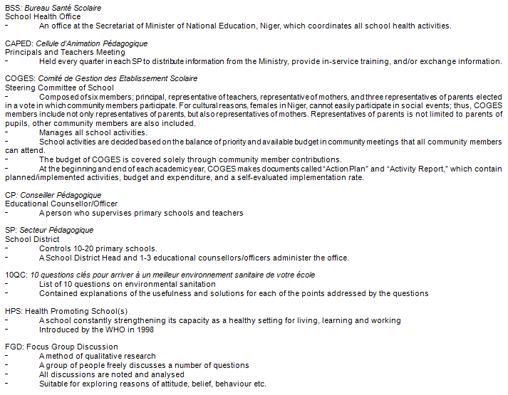 The authors acknowledge the tremendous support of Mr Mounkaila Mahamadou, Ms Mariama Tahirou, both from Bureau Santé Scolaire, the Ministry of National Education, Mr Aboudou Yacouba from Organisation Nigerienne des Educateurs Navaturs (ONEN) and Mr Seyni Yacouba form Direction Départementale de la Santé Public et lutte contre les Endémies (DDSP/LCE) in Dosso, to conduct focus group discussion. The authors thank the Niger Ministry of National Education, the Japan International Cooperation Agency (JICA), the JICA office in Niger, and the 'Schools for All' project in Niger, for their cooperation with the project. The authors are grateful to all staff of Bureau Santé Scoraire, the Ministry of National Education, Niger, for their contribution to intervention and data collection. This work was supported by a Grant for Research on Global Health and Medicine (21A-3, 24A-2) from the Ministry of Health, Labour and Welfare, Japan.