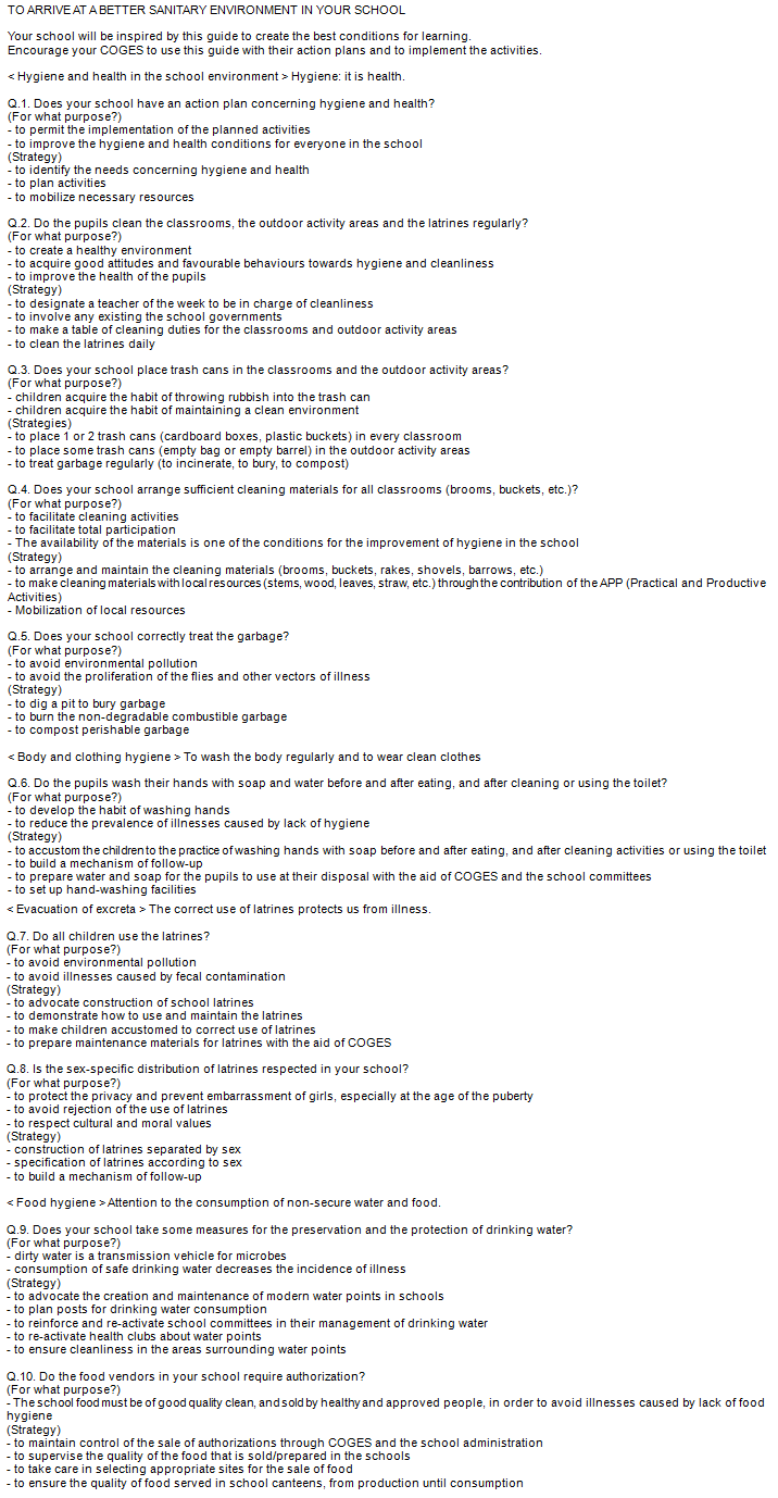 Thirty selected primary schools were observed twice (before and after observation) and principals and teachers were interviewed. The results of these observations were that 87% (26/30) of schools showed some improvement in hygiene status. From the interviews, several points of improvement emerged, such as 'the contents of the check list and the activity guide do not correspond well' and 'the school activities were decided by Comité de Gestion des Etablissement Scolaire (COGES, Appendix II) at the beginning of the academic year, so it was difficult to perform the activity due to the pre-allocated budget'. To solve these problems and to simplify the program as much as possible, the self-evaluated check list was integrated with the Healthy Activity Guide. The document was modified to a 'question and answer' form that listed '10 key questions (10QC) to help your school obtain a better sanitary environment' (10 questions clés pour arriver à un meilleur environnement sanitaire de votre école). Along with the 10 questions, the list contained explanations of the usefulness and solutions of each of the points addressed by the 10QC (Appendix III).