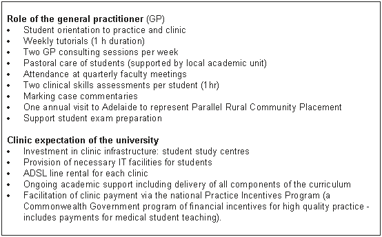 GPs with previous teaching experience who indicated some enthusiasm for the program were initially approached with the view to finding a 'GP champion' in each of the four practices where the PRCC students were to be placed. In each practice, the GPs initial worries included concern about time, clinical exposure, the organization of the program, and the infrastructure needs of their practice in order to support students. Once these initial concerns were worked through, a letter of understanding was developed clearly stating the roles and responsibilities of both the GP and the University (Fig 2). The academic staff responsible for developing the program worked hard to acknowledge GP anxiety and then presented to GPs the evidence available regarding Community Based Medical Education programs and in particular the experience of the Riverland PRCC program. Enthusiasm for the program developed relatively quickly, and many GPs rapidly embraced the concept of the PRCC program.