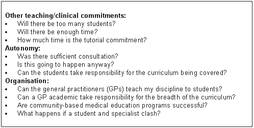 The specialists also expressed concern regarding the transfer of loyalties to another university's students, but were anxious not to increase their total teaching time. Procedural specialists, in particular, expressed concern that their speciality area would not be given enough weighting if students, lead by GP supervisors, took responsibility for their own learning. Non-proceduralist engagement has paralleled more closely the partnership development of GPs.