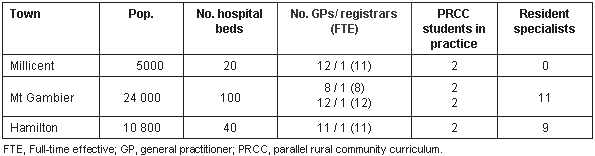 In 2002, Millicent was a town with a population of 5000, 50 km west of Mt Gambier. There was one general practice in the town with 11 full-time equivalent (FTE) doctors and one solo GP not involved in the PRCC program. Mt Gambier was the central town in the proposed GGT PRCC area and had a population of 24 000. There were two practices with 8 FTE and 12 FTE doctors respectively, each with capacity for two PRCC students. There was also one solo GP not involved in the PRCC program and 11 specialists (anaesthetists, general and orthopaedic surgeons, gynaecologists, physician and a paediatrician) with variable involvement. Hamilton, 110 km east of Mt Gambier, had a single medical practice which combined three physicians and 11 FTE primary care doctors. There were six other resident specialists with variable involvement in the PRCC program. There was a hospital in each of the three towns involved in the PRCC program.