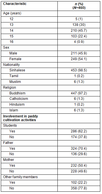 The study included 460 subjects with a response rate of 100% (460/460). Sociodemographic characteristics of the study population and details of involvement in paddy cultivation activities by the students themselves, their parents and other family members are presented in Table 1. A total of 271 students (58.9%) were studying in grade 9 and 189 (41.1%) in grade 10. The mean age of the study population was 13.9 years (standard deviation (SD) 0.8 years) and 249 (54.1%) were female. The majority were Sinhalese (98.5%, n=453) and Buddhists (97.2%, n=447). A total of 286 (62.2%) students were involved in paddy cultivation activities either frequently or rarely. A total of 102 (22.2%) students reported that their family members were involved in paddy cultivation. Most fathers (70.4%, n=324) were involved in paddy cultivation, while half of the mothers (50.4%, n=232) were also involved.