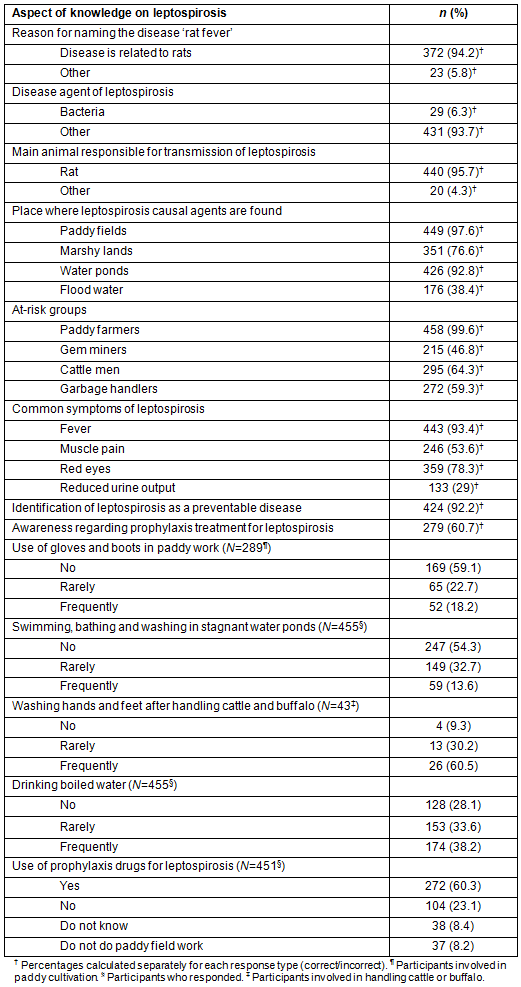 The Statistical Package for Social Sciences v17.0 (SPSS; http://www-01.ibm.com/software/analytics/spss) software was used for data analysis. Sociodemographic characteristics of the study population were described using frequency distributions. Knowledge level was assessed by scoring each question. The minimum score was 0 and maximum 91. Each correct response to knowledge questions received one mark, while incorrect responses or 'do not know' were given a score of zero. Prior to data analysis an expert panel defined a 'good' level of knowledge about leptospirosis as a score of 60% or more. A respondent accurately responding to all the questions assessing 'core' knowledge would have obtained a score of 60% and that was the basis for this cut-off. Core questions related to the main animal responsible for transmitting leptospirosis, the modes of entry of the organism to the human body, population groups at higher risk of getting leptospirosis and the places that are likely to promote transmission of leptospirosis, common initial symptoms of leptospirosis, practices to be adopted to prevent the disease occurring including prophylactic drugs and what one should do if a person is suspected to have leptospirosis. The non-core questions related to the type of causative agent, distribution and trend of rat fever in the country, distribution and trend of rat fever in their own area and to complications of leptospirosis.