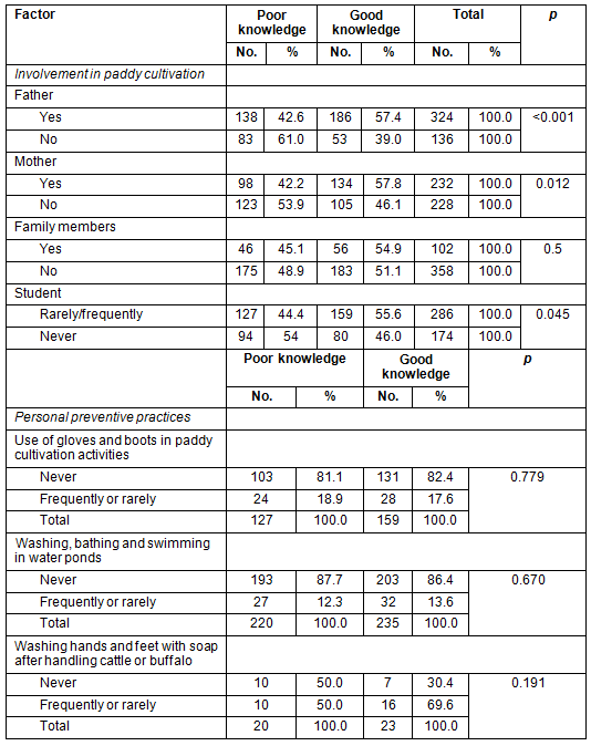 Involvement of parents and other family members in paddy cultivation, involvement of students in paddy cultivation and use of personal protective practices by students with the student's knowledge on leptospirosis was assessed using the χ2 test. Logistic regression analysis was performed to assess adjusted odds ratios (OR) and 95% confidence intervals (CI) of factors predicting leptospirosis preventive practices among students.