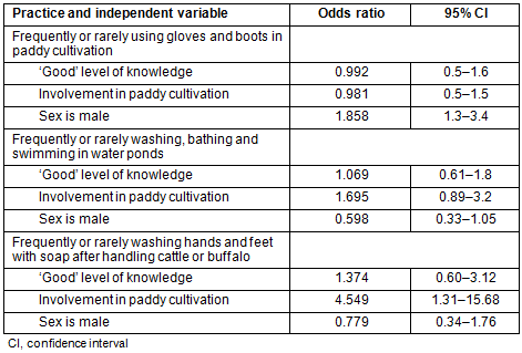 The results of logistic regression analysis for evaluating associations between selected variables and practices for preventing leptospirosis are shown in Table 5. Being a male (OR 1.9, 95% CI 1.3-3.4) was significantly associated with frequent use of gloves and boots in paddy cultivation, while being involved in paddy cultivation was significantly associated with frequent washing of hands and feet with soap after handling cattle and buffalo.