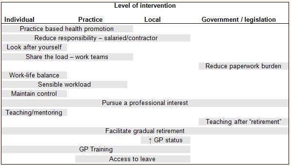In order to gain an overview of how to start to develop and implement effective solutions to this pressing workforce problem, potential solutions were developed, based on the results of this study (Fig2). These were then categorised and assigned a level of intervention, with many spanning several levels; for example, the category 'sensible workload' not only depended on the individual GP making arrangements and putting strategies in place to achieve and maintain a sustainable workload, but also relied on group practices, for instance, to support GPs in achieving this by accommodating flexibility in their financial and staffing structures. The authors acknowledge that this is a simplified view of the often complex dynamics underlying workforce retention, but it assists in the conceptualisation of the multifaceted interventions required to keep valuable, experienced rural GPs in the workforce.
