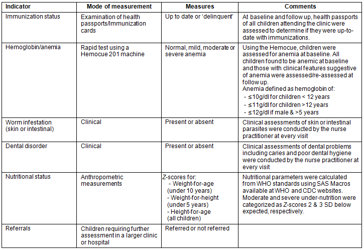 Prior to the study commencement, six outcome measures were chosen, based on previous experience and in consultation with the mobile clinic nurse practitioner: (i) immunization status assessed by examining children's health records; (ii) number and frequency of referrals; (iii) clinical and laboratory presence of anemia (all children had blood tests for anemia at base line and at follow up only those anemic at baseline or who had clinical features of anemia in the follow-up months were reassessed with blood tests); (iv) clinical diagnosis of skin and/or intestinal parasitic infections; (v) presence of dental disorders; and (vi) nutritional status. Details of the assessment of these health conditions are provided (Table 1). At each visit, children were assessed for all six health indicators. The first assessment (referred to as 'baseline') occurred in the first 2 months of the mobile clinic's visit to the sites (June and July 2011), while 'follow up' occurred during the last 2 months (December 2011 and January 2012).