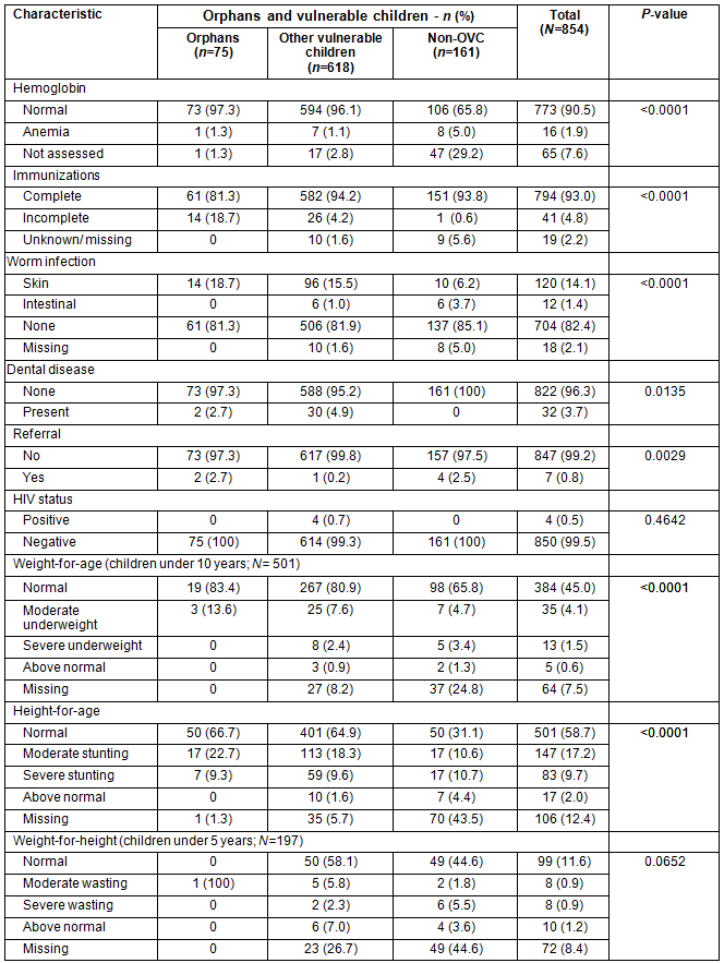 Studies examining health indices in children have shown mixed results when comparing OVC to children who are neither orphaned or vulnerable (non-OVC). Some studies have shown that OVC were more likely to self-report morbidity6, develop a fever, diarrhea or acute respiratory tract symptoms; less likely to have complete vaccinations7; and have lower weight-for-height Z-scores than non-OVC8. In contrast, other studies have not found a difference in the prevalence of fever, malaria parasitemia, hemoglobin level or height-for-age Z-scores9. Very few studies have evaluated the impact of an intervention on important health indices.