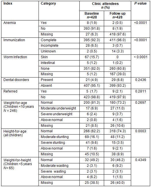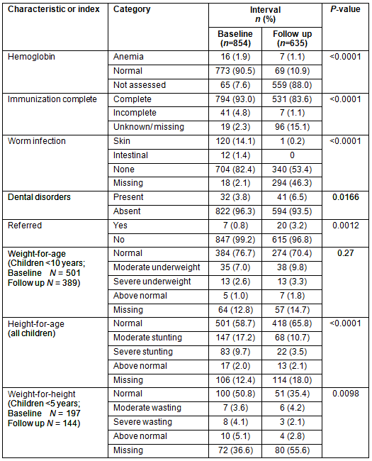 The overall study group at baseline (n=854) was reduced to 635 at follow up. Over the study period there was considerable reduction in children with outstanding immunizations (from 5% to 1% [p<0.0001]), and the prevalence of skin and intestinal parasites (from 15% to 0.2% [p<0.0001]) (Table 3). There was also an increase in identified dental disease (4% to 7%; p=0.0166) and in the proportion of children referred to a larger healthcare facility (1% to 3%; p=0.0012). While there was no significant change in weight-for-age (p=0.27) in children under the age of 10 years, there was a significant reduction in stunting (height-for-age) (p<0.0001) for all children. A reduction in moderate and severe stunting was also observed (from 17.2% to 10.7% & 9.7% to 3.5%, respectively), as well as an increase in normal height-for-age (from 58.7% to 65.8%). Additionally, there was a decline in severe wasting (from 4.1% to 2.1%), though significant data on weight-for-height were missing.