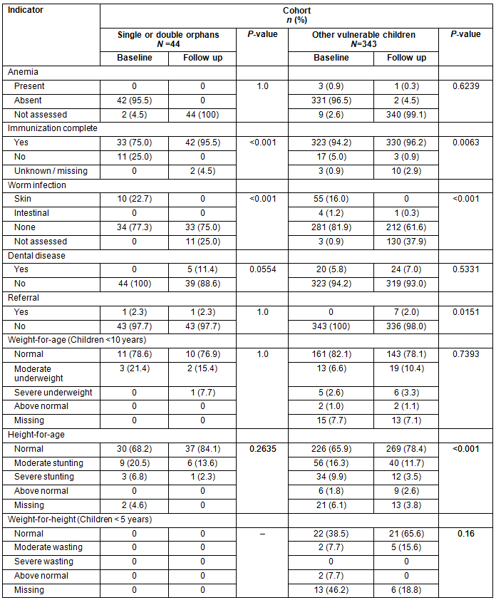 When comparing across vulnerability groups there were significantly more orphans having incomplete immunization (25%) compared with other vulnerable children (5%) and non-OVC (0%) (p<0.001) at baseline (Table 2). Orphans also had a higher proportion of skin and intestinal parasites at baseline compared with the other two groups (22.7% vs 17.2% vs 6.9% p=0.072). In contrast at baseline, none of the orphans were found to be anemic while up to 12% of the non-OVC was found to be anemic (p<0.0001). There were also significantly more non-vulnerable children requiring referral at baseline. There was no significant difference in the distribution of nutritional parameters among children's groups.