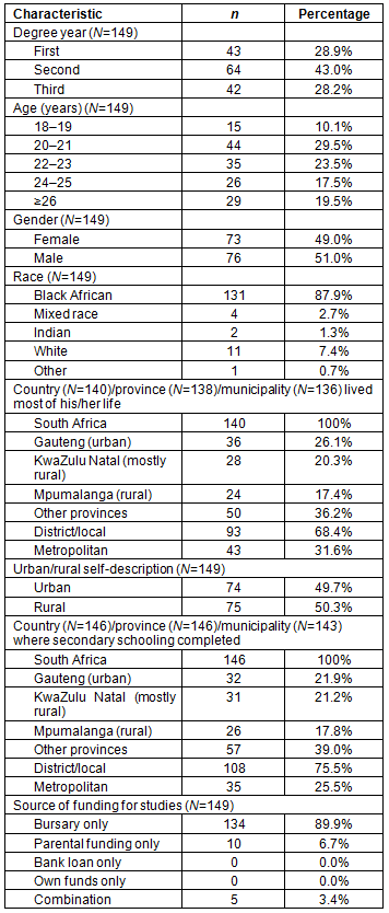 The vast majority of participants (70.5%) were between 20 and 25 years of age. Only 18.1% of participants had entered the BCMP program directly after completing their schooling. There were slightly more male (51.0%) than female (49.0%) participants. The participants were mainly Black African (87.9%). Gauteng (urban), KwaZulu Natal (mostly rural) and Mpumalanga (rural) were most frequently mentioned as the provinces where the participants had spent most of their lives and the provinces where secondary schooling was completed. Most of the participants (68.4%) had lived most of their lives in a district/local municipality as opposed to one of the eight metropolitan municipalities. Just over half (50.3%) of the participants described the area where they had lived most of their lives as rural. The main source of funding for the BCMP studies were bursaries, with 89.9% of students being funded solely by a bursary. The key sociodemographic characteristics of the participants are displayed in Table 1.