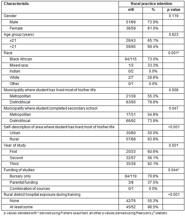 Bivariate analysis: Table 2 displays the bivariate analysis of rural practice intentions of students directly after graduating, and sociodemographic and other characteristics. Only the students who intended to practise as clinical associates in South Africa directly after graduating were included in the analysis. There were no significant differences between male and female students (p=0.119) and younger and older students (p=0.623) with regards to their rural practice intention. Amongst third-year students, 92.1% had a rural practice intention compared to 56.1% of the second-years and 60.6% of the first-years. Black African students were more likely than students of other race groups to have an intention to practise in a rural area as were students funded by bursary only compared to those that received funding from other sources. Students who had lived most of their lives in a district municipality were more likely than those that had lived most of their lives in a metropolitan municipality to have an intention to practise in a rural area (p=0.008). Students who had self-described the area they had lived most of their lives as rural were more likely to have a rural practice intention than those who described it as urban (p<0.001). Those students that had had at least some rural district hospital exposure during training were more likely to have a rural practice intention than those that had had no exposure (p<0.001).