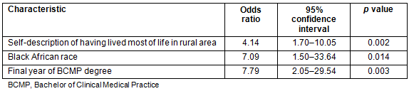 Multivariate analysis: The variables with p<0.1 on bivariate analysis were included in the initial full logistic regression model. Some categories were combined prior to inclusion in the model. With regards to year of study, first- and second-year were combined. With regards to race, the mixed race, Indian (South Africans of Indian descent), white and 'other' groups were combined to form a single category due to their small numbers. Similarly all sources of funding other than bursary only were combined. The final model following elimination consisted of the three variables shown in Table 3. Self-description of having lived most of one's life in a rural area (p=0.002), Black African race (p=0.014), and being in the final year of the BCMP program (p=0.003) significantly increased the likelihood of rural practice intention.