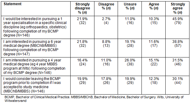 The students' interest in pursuing a medical degree and BCMP specialisation were elicited using Likert-scale questions. The results are displayed in Table 4. More than half the students appeared interested in a BCMP specialisation. Slightly more students were interested in pursuing a 6-year rather than a 4-year medical degree. A substantial number of students would consider leaving the BCMP program if they were accepted to study medicine. Of the 117 students who responded to the question regarding their preferred clinical discipline if a 1-year post-BCMP specialisation was offered, 20.1% (n=20) indicated orthopaedics, 16.2% (n=19) preferred obstetrics and gynaecology and 13.7% (n=16) indicated casualty or trauma. Paediatrics (n=14), anaesthetics (n=10), cardiology (n=10) and surgery (n=9) were also popular specialties amongst the participants.
