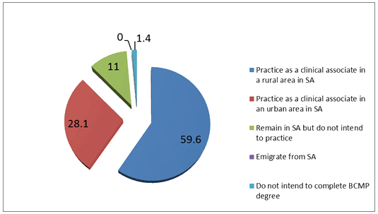 In creating this new cadre of health worker in South Africa the assumption by the various stakeholders was that clinical associates would work in district hospitals in South Africa and would to some extent fill the void left by a shortage of medical practitioners in rural areas. There was a need for evidence to support this hypothesis. In addition, the proportion of BCMP students intending to work in urban areas, migrate to other countries and pursue medical degrees has human resource implications. The objectives of the study were, therefore, to determine the practice intentions and practice preferences of BCMP students with regards to geographical location and to determine the future study plans of BCMP students. An additional objective was to determine the factors associated with rural practice intentions directly after graduating as this may be useful in adapting the recruitment strategy and strengthening the educational programs of the three BCMP programs in South Africa in order to increase the output of clinical associates willing to work in rural areas.