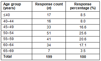 The largest proportion belonged to the 50-54 year old age group (25.6%), followed by 55-59 years olds (20.6%), and 60-64 year olds (17.1%). About 33% were less than 50 years old.