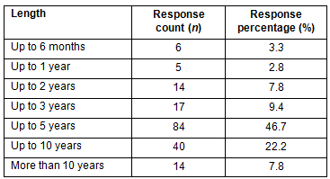 Nearly 20.0% of respondents had been working in the NT for less than 2 years, and nearly 15.0% had been working in the NT for more than 25 years. About 19.0% had been working in the NT for 3-5 years and a further 19% for 6-10 years.